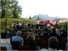 unten v.l.n.r.: Auftaktveranstaltung Stadthalle Altenmarkt, Sächs. Bläserphilharmonie auf dem Gernkogel (ca. 1600m)
